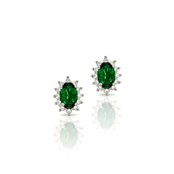 • Σκουλαρίκια καρφί Λευκόχρυσα Κ14 Ροζέτα Οβάλ και πράσινη πέτρα ζιργκόν
