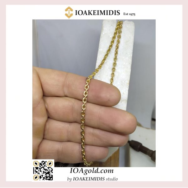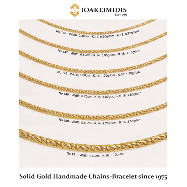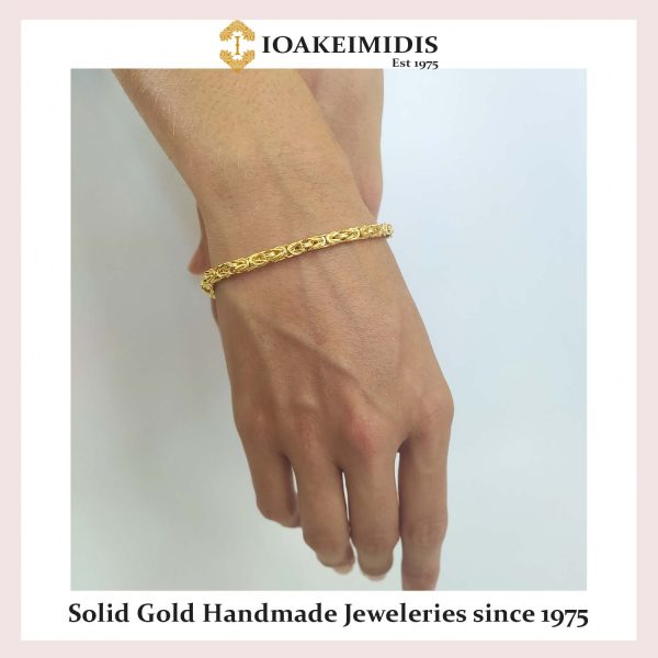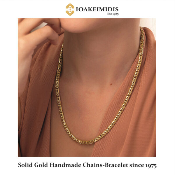 The art of Handmade chain-Bracelet (Completely handmade from start to finish, every single link) in classic and unique designs is one of the basic features that has established the Ioakeimides Jewellery collection since 1975. The aesthetics and the result of human handmade effect on processing gold is undeniably much better than any other industrialized Chain-bracelet. In seven different styles you will find the one it been perfect for you, as a necklace or bracelet in the best quality of Solid Gold.